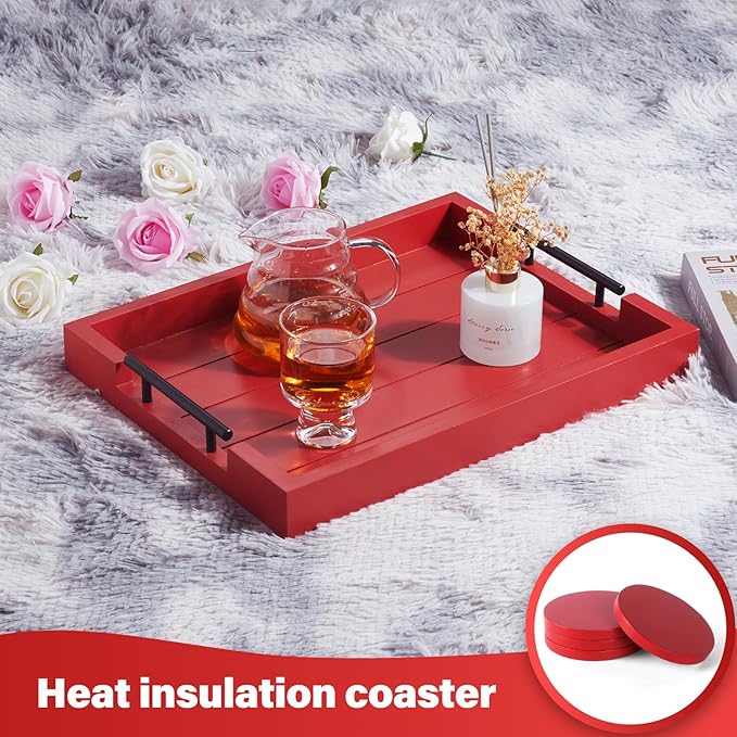 - INCLUDED WOODEN COASTERS SET OF 4 – Along with our wooden serving trays, we also provide a set of 4 natural wooden coasters that have a tasteful torched appearance. These wooden coasters for drinks are the best way to protect your tables from spills, mess, and stains while also adding a decorative element to your home, uplifting the overall aesthetic appeal – MUST HAVE ottoman tray with handles can be used as a Drink Tray!