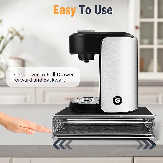 - Kitchen Count Top Organizer: The functional and hassle-free style allows you to stand any coffee brewer on top of the drawer. With a chic black powder-coated finish, this holder will fit perfectly into your kitchen, dorm countertop, or office coffee bar.
