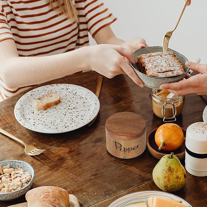 Acacia Wood Spice Box with Swivel Cover for Kitchen Countertop,Salt Keeper with Built-in Spoon,Modern Farmhouse Kitchen Decoror for Storing Seasonings (Labeled Salt & Pepper)