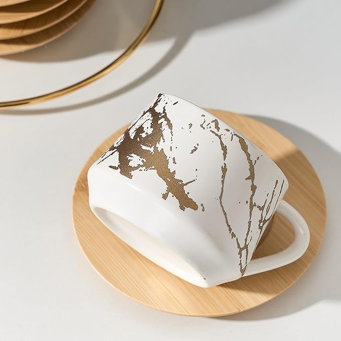 LUKA Ceramic Espresso Cups with Saucers and Metal Stand, Small 4 oz Porcelain Demitasse Cups Set of 6, Cute Cappuccino Coffee Cups for Double Espresso, Tea, Marbling White