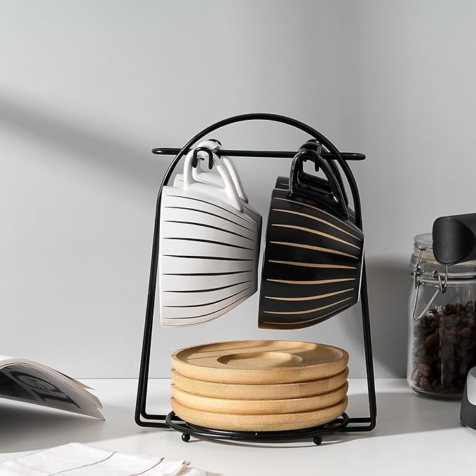 LUKA Ceramic Demitasse Espresso Cups Set with Saucers and Metal Stand, 8 oz Porcelain Cappuccino Cups Teacup For Tea, Espresso, Latte, Coffee, Cafe Mocha, Set of 4, Stripe White & Black