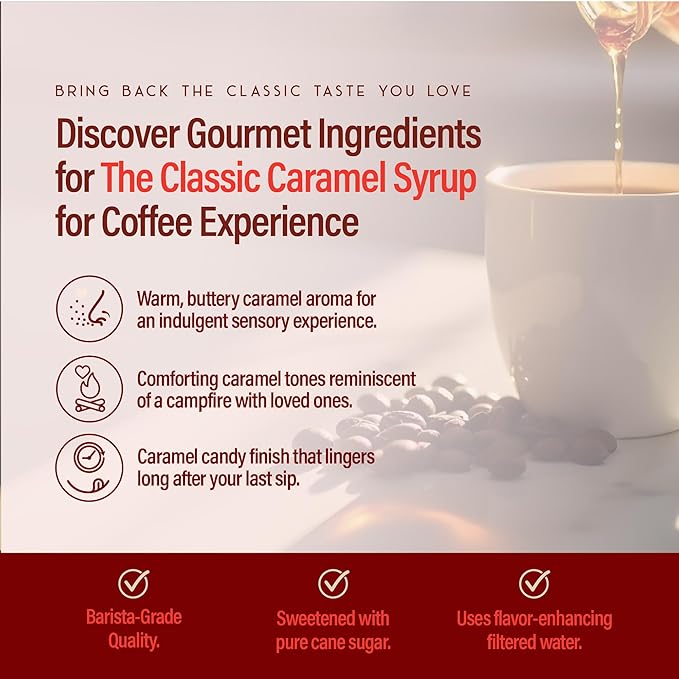 - DISCOVER GOURMET INGREDIENTS FOR THE CARAMEL FLAVOR SYRUP FOR COFFEE EXPERIENCE: Use the flavored syrup to enrich your coffees, lattes, teas, smoothies, overnight oats, cocktails, and more.