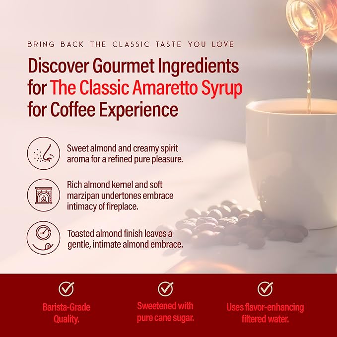- DISCOVER GOURMET INGREDIENTS FOR THE AMARETTO FLAVOR SYRUP FOR COFFEE EXPERIENCE: Use the flavored syrup to enrich your coffees, lattes, teas, smoothies, overnight oats, cocktails, and more.