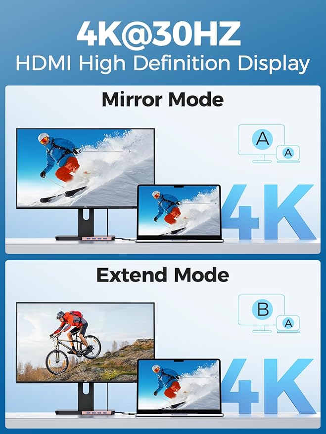 - 4K High-Definition Output: Just connect the usb c multiport adapter to HDMI port, and you can instantly achieve vivid 4K@30Hz (3840x2160) video and audio transmission, which can be mirrored or expanded. Transfer vivid on-screen 3D effects from your laptop screen to monitors, projectors, HDTVs, and more. USB C hubs give you more workspace and are perfect for home offices.