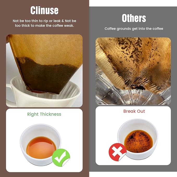 - [Safety & Health Friendly]: Clinuse disposable coffee filter paper is made of natural wood pulp, does not contain fluorescence and bleach, keeps healthy and eco-friendly, and keeps coffee pure and mellow