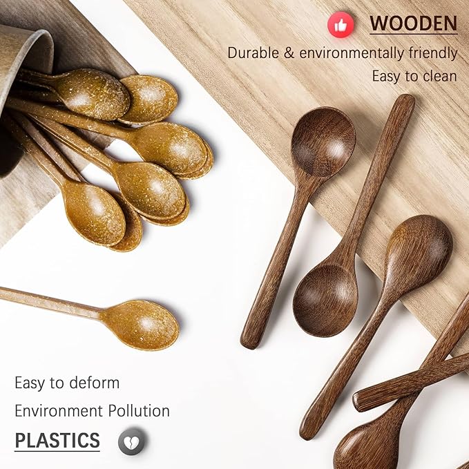 - PREMIUM HARDWOOD ELEGANCE: Crafted from select hardwood, these 7 inch wooden spoons for eating are a testament to timeless elegance. Elevate your dining with the charm of nature's finest