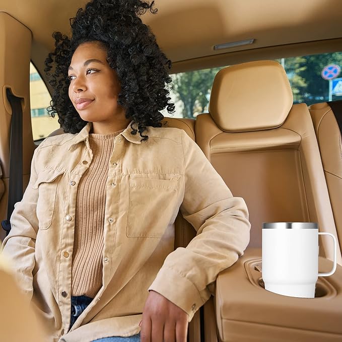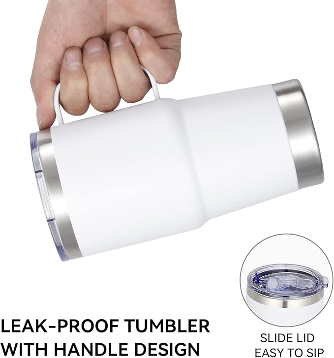 - Cupholder Friendly: The travel coffee tumbler 20oz is designed with a tapered shape which fits most car cup holders, equipped with a sturdy handle that allows easy carrying. Diameter 3.38" large cup mouth makes it easier for you to clean the stainless steel mug