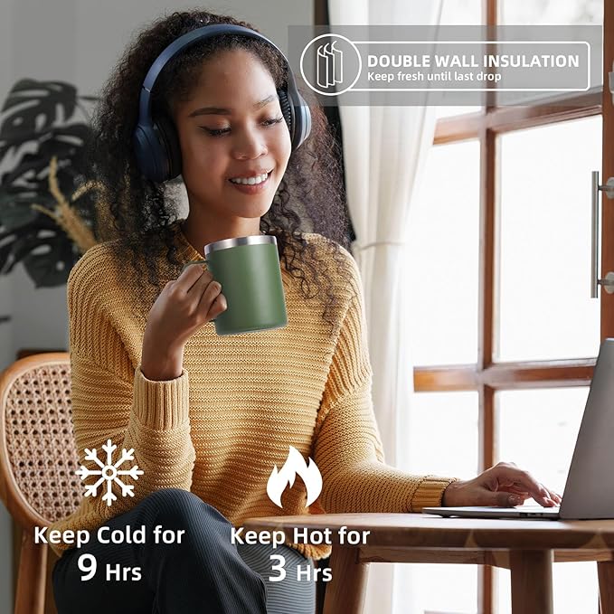 Volhoply 12oz Insulated Leakproof Coffee Mug with Flip & Straw Lid Bulk 8 Pack,Double Wall Vacuum Stainless Steel Travel Tumbler Cup with Handle,Reusable Camping Mugs Keep Cold(Army Green,8 Set)