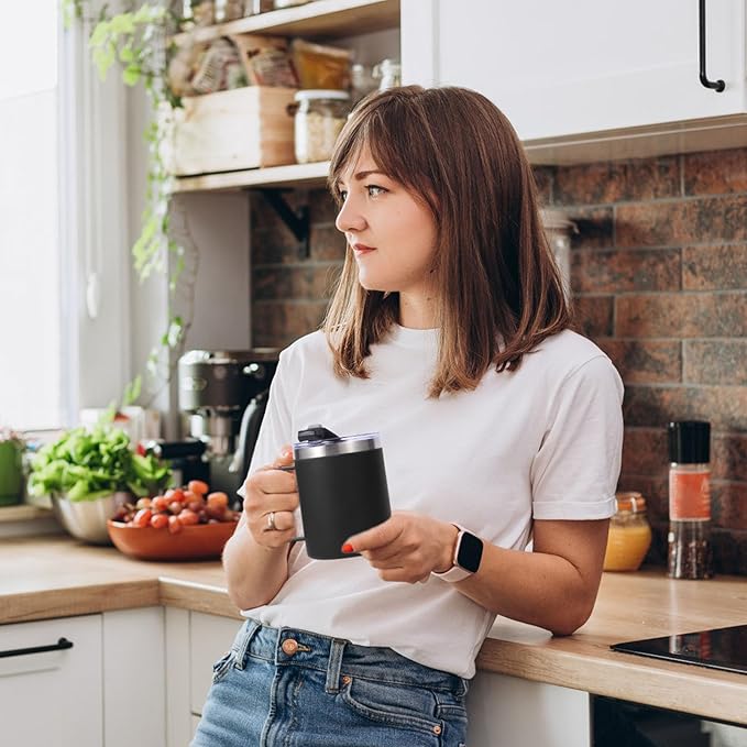 Volhoply 12oz Insulated Leakproof Coffee Mug with Flip & Straw Lid,Double Wall Vacuum Stainless Steel Travel Cafe Tumbler Cup with Handle,Reusable Camping Mugs Keep Cold/Hot(Black,1 Set)