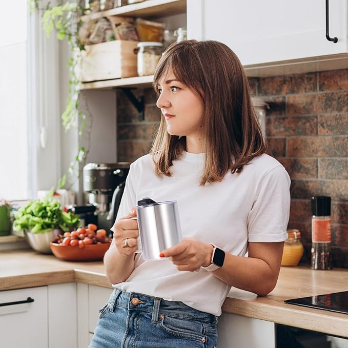 Volhoply 12oz Insulated Leakproof Coffee Mug with Flip & Straw Lid Bulk 4 Pack,Double Wall Vacuum Stainless Steel Travel Tumbler Cup with Handle,Camping Mugs Keep Cold/Hot(Silver,4 Set)