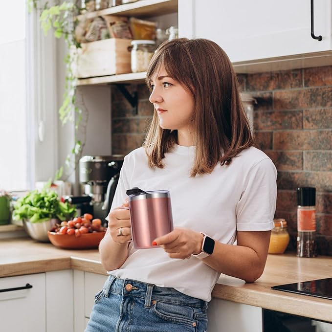 Volhoply 12oz Insulated Leakproof Coffee Mug with Flip & Straw Lid Bulk 2 Pack,Double Wall Vacuum Stainless Steel Travel Tumbler Cup with Handle,Reusable Camping Mugs Keep Cold/Hot(Rose Gold,2 Set)