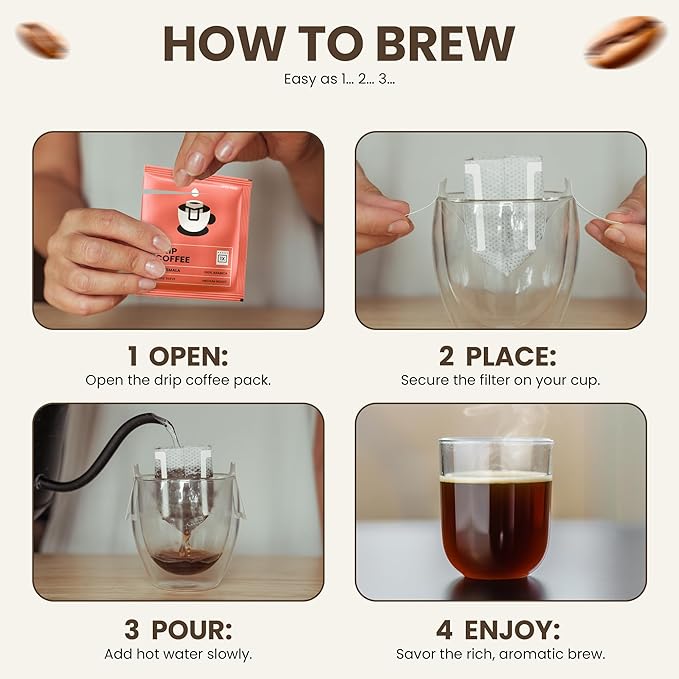 - Single-Origin Variety Pack: Enjoy the distinct flavors of Colombia, Guatemala, Brazil, and Ethiopia in 20 individually sealed drip coffee packs.