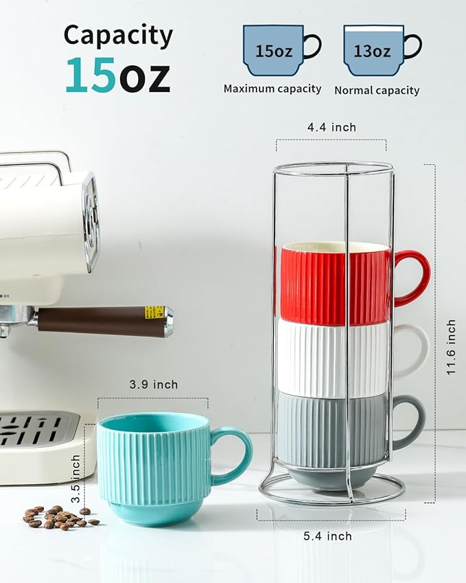 Hasense Ceramic Coffee Mug Set of 4 with Rack - 15 oz Stacking Ribbed Latte Cups Set for Cappuccino, Tea, Hot Cocoa, Drinks - Wedding & Housewarming Gifts Assorted Colors
