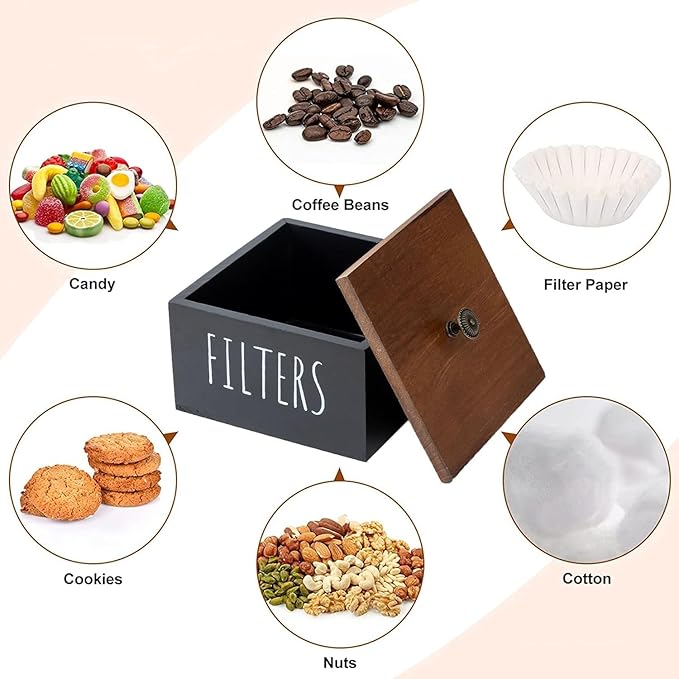 - ✔ Rustic Farmhouse Style - The perfect way to hide unsightly coffee filters without taking up space anymore, complements any countertop decor, matches your coffee bar. Classic black color and whiteletter "filters" match for a rustic vintage style for your coffee filter. This coffee filter container are made by hand, which means each piece will be unique.
