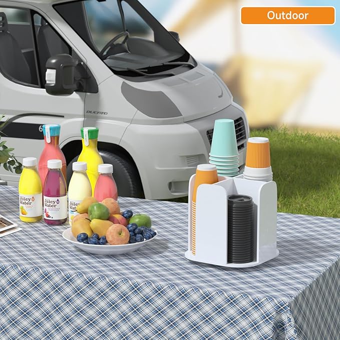 - SPACE SAVING - cup organizer holds standard 3.54 inch rim sized 10 oz, 12 oz and 16 oz lids or disposable cups in each compartment, neat and attractive, maximizing paper or plastic cup storage capacity while minimizing your countertop space.