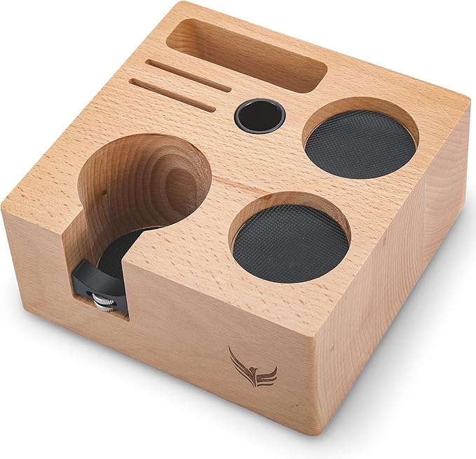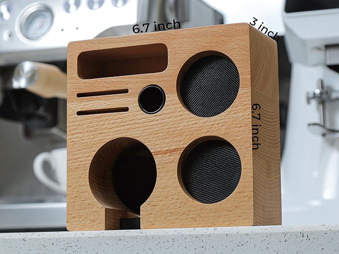 - Crafted from durable, natural beech wood, this stylish coffee tamp box adds elegance to your coffee setup and keeps all your espresso tools neatly organized. The anti-slip silicone base ensures stability during tamping, protecting your countertop from scratches, spills, and coffee grounds