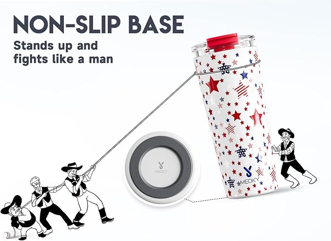 - NON-SLIP BASE. With non-slip base, Meoky travel coffee tumbler stands up and fights like a man.