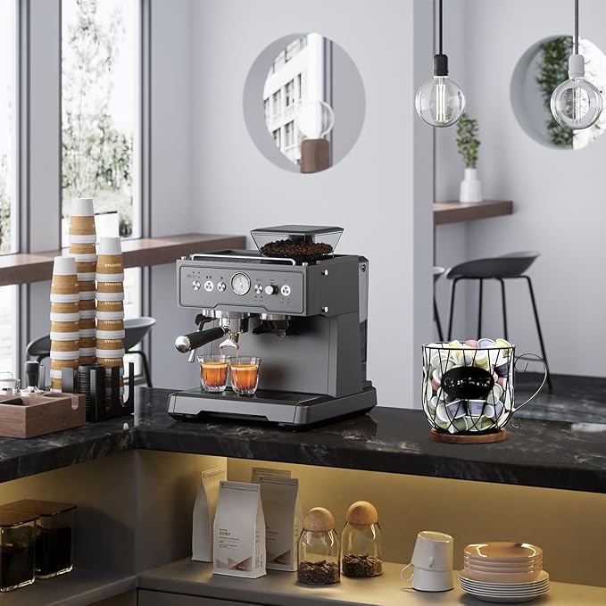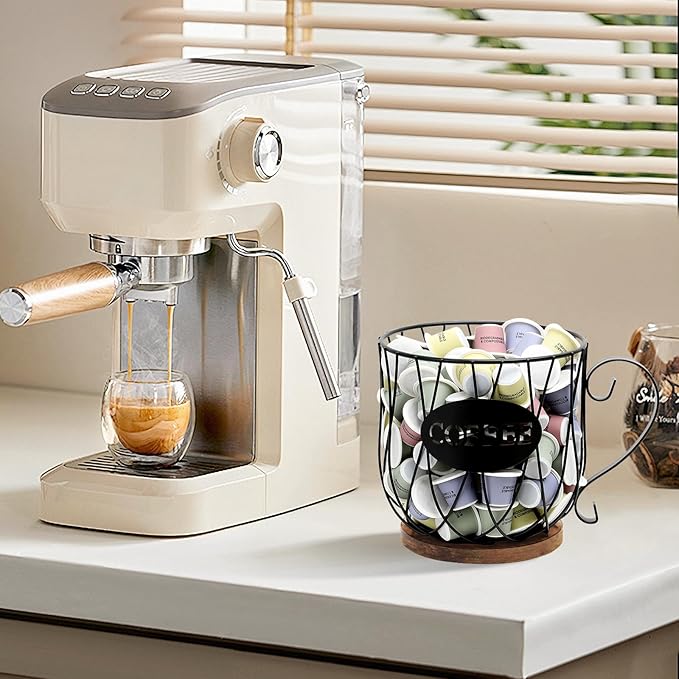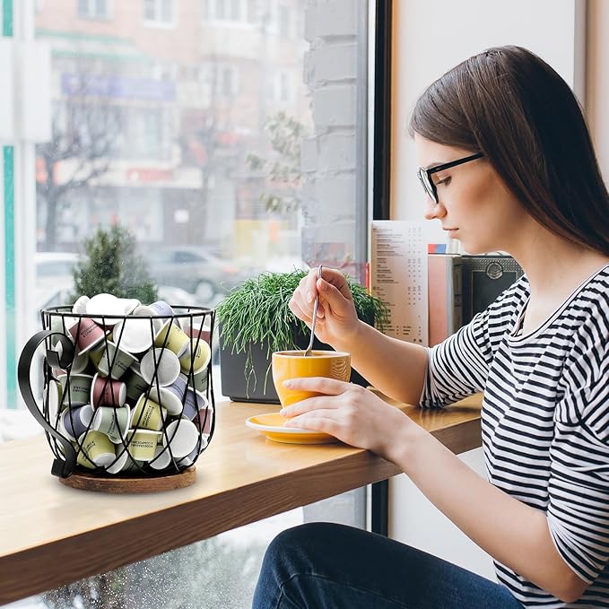 - ATTRACTIVE VINTAGE DECOR: Give your coffee bar a stylish upgrade with our coffee pod holder, crafted with frosted iron wire and rustic brown wood panels for a touch of elegance. Ideal for any countertop in the kitchen or office