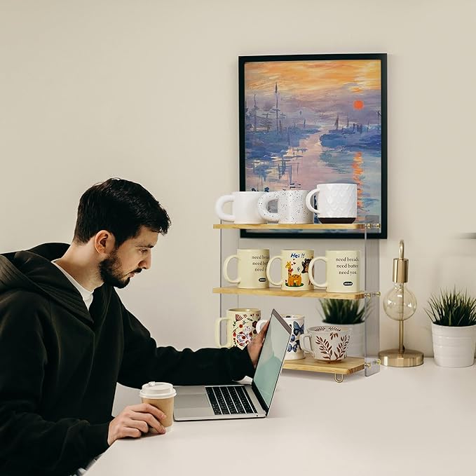 - Stylish Design: Featuring wavy acrylic side panels and a natural wood board. The sturdy construction ensures that it can hold the weight of multiple mugs without wobbling or tipping. this organizer presents an aesthetically pleasing texture, ideal for coffee bar enthusiasts and those who love to decorate their spaces.