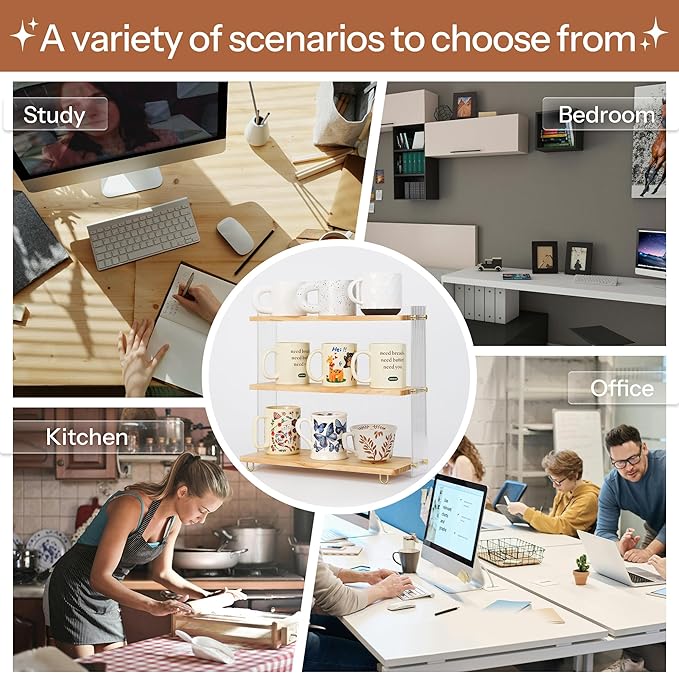 - 3-Tier Space-Saving Solution Wooden Cup Holder: 16.1*6.5*14.8 inch. The Wooden Coffee Cup Holder is designed to efficiently organize coffee cups. Optimize countertops with open shelves designed to hold mugs, coffee bar accessories, plants, or decor. Lightweight yet sturdy, it organizes clutter while displaying items with easy-access visibility.Whether it's your kitchen, office, or cafe, it will help you maintain a neat and tidy environment., with each tier spaced to ensure stability and ease of access.