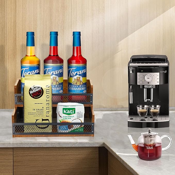 - STURDY & DURABLE: The coffee syrup stand is made of sturdy wood, which has smooth surfaces without worrying about stabbing hands. The height between each tier is carefully designed to ensure that you can use the syrup pump while the bottle is on the syrup holder for coffee bar
