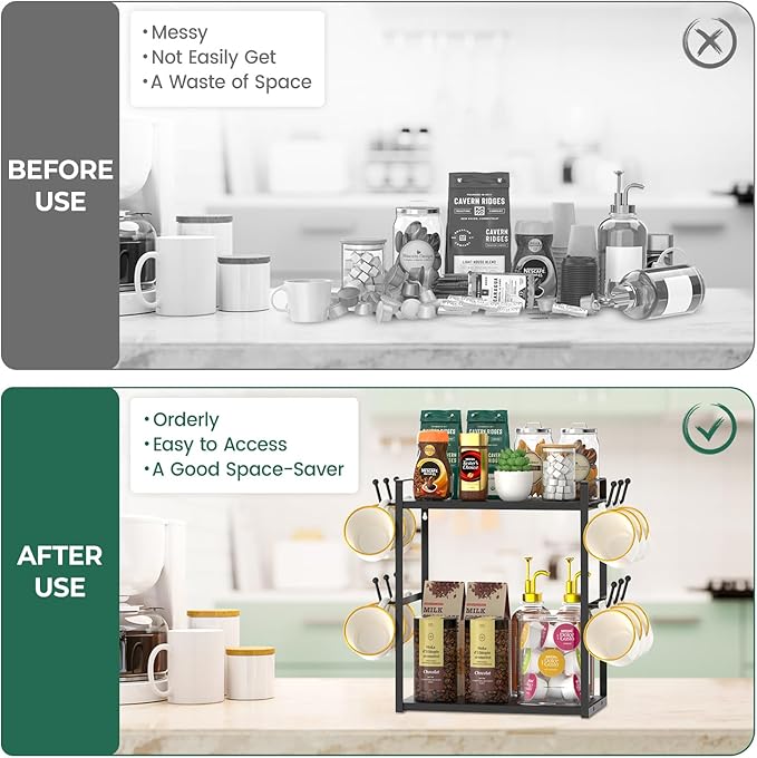 - Ample Dual-Tier Storage: Elevate your coffee experience with EsLuker.ly's 2-tier coffee mug holder for kitchen. With two shelves and 12 hooks, it offers ample space for coffee essentials, perfect for home or office countertops, meeting the storage needs of any coffee enthusiast
