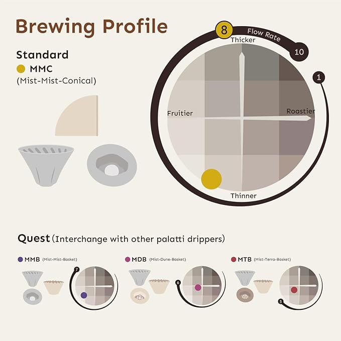 - High Flow Rate for a Vibrant Cup: Featuring wider spiral ribs and a larger opening, Mist is engineered for a high flow rate, delivering an agile and dynamic brewing experience that results in a lively, flavorful cup.