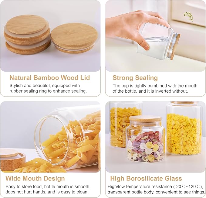 - MULTIFUNCTIONAL JAR: 7.49cm/2.95inch wide mouth design, 3 types of containers with different capacities can meet different storage needs. The airtight glass jar is good to preserve various food like jams, chutneys, flour, cereal, grain, sugar cube, spices, nuts, tea, dried beans and your favourite snacks like biscuits, cookies, chocolates.