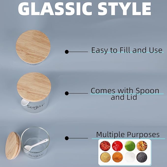 - DESIGN: Our Glass Sugar Bowl with silicone sealing serving dipper and Lid is a stylish addition to any kitchen or dining table. Its clear glass and lid combination create a simple, yet elegant design that complements any decor