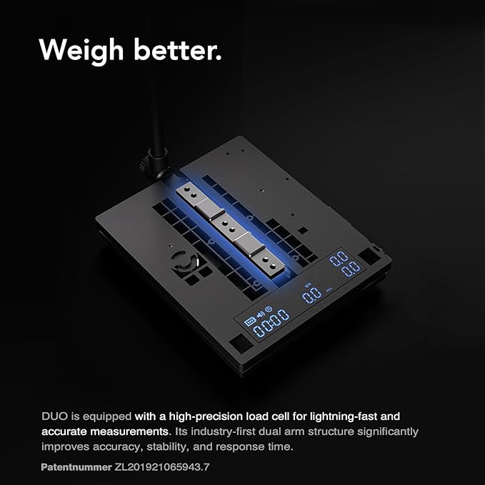 - [ All-New Weighing Sensor ] DUO's dual arm load cell brings improved precision and response times, ensures precise measurements ranging from 0.1g to 2kg (with an initial minimum weight of 0.5g). The advanced sensor technology ensures that every gram is accounted for, providing the consistency essential for crafting the perfect cup