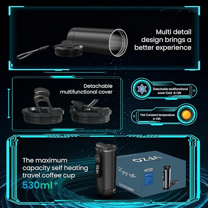 - The VFZO smart coffee mug adopts professional heating technology.VFZO self heating coffee mug - Durable Battery (4000mAh) LED real-time temperature display settings.Heated coffee mug not only heats up beverages and keep the beverage in a constant temperature state for 4-10 hours ,but also has the function of charging your phone, allowing you to enjoy the high-quality life brought by technology at any time