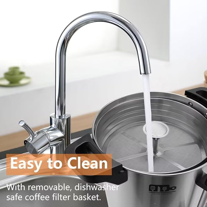 - 🍽️【EASY TO CLEAN】This coffee pot is designed with easy maintenance.Features food grade 304 S/S body and removable 304 S/S filter basket allows for hassle-free cleaning and ensures that your coffee remains free from any sediment. No paper filter needed. Simply detach the components, the brushed stainless steel interior wipes clean easily with a damp soapy cloth, rinse them under running water, and they'll be ready for the next brewing session.And the Non drip faucet can keep surfaces clean too.