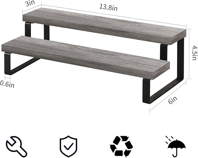 - Quick Setup & Easy Cleaning: You can have this 2-tier display riser stand assembled in 10 minutes with detailed instructions and tools. The wooden surface is waterproof and dust-free, a damp cloth could keep the counter shelf clean. (Assembly tools and accessories are included in the package)