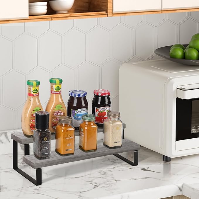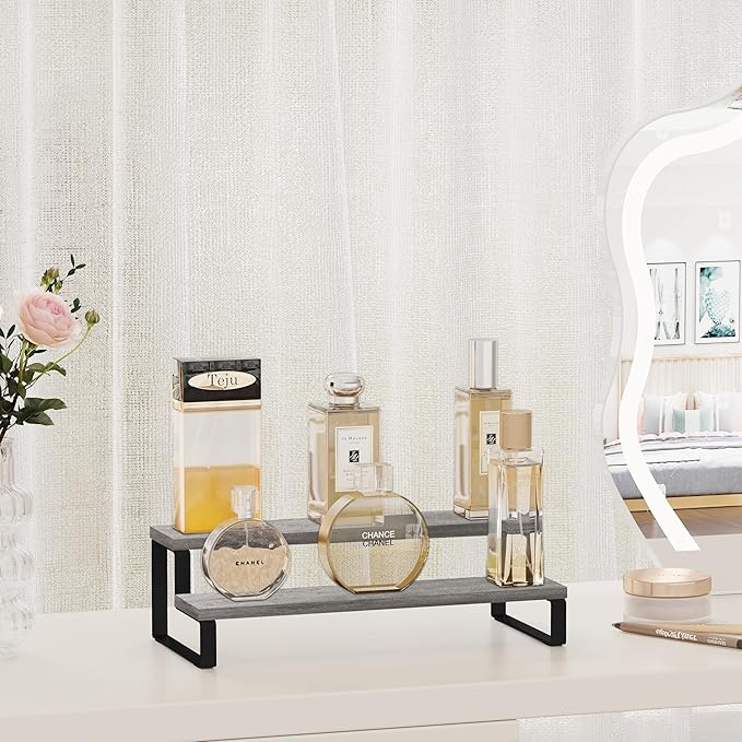 YINMIT Wooden Display Riser Stand, Tiered Perfume and Cologne Organizer Stand, 2 Tier Spice Rack Organizer, Rustic Display Shelf for Candles (2 Tier,Grey)