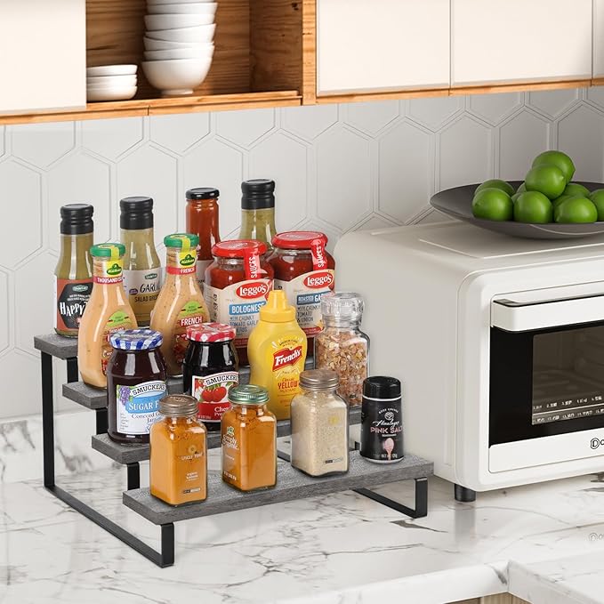 YINMIT Wooden Display Riser Stand, Tiered Perfume and Cologne Organizer Stand, 4 Tier Spice Rack Organizer, Rustic Display Shelf for Candles (4 Tier,Grey)