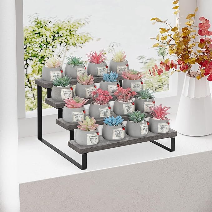 - Quick Setup & Easy Cleaning: You can have this 4-tier display riser stand assembled in 10 minutes with detailed instructions and tools. The wooden surface is waterproof and dust-free, a damp cloth could keep the counter shelf clean. (Assembly tools and accessories are included in the package)