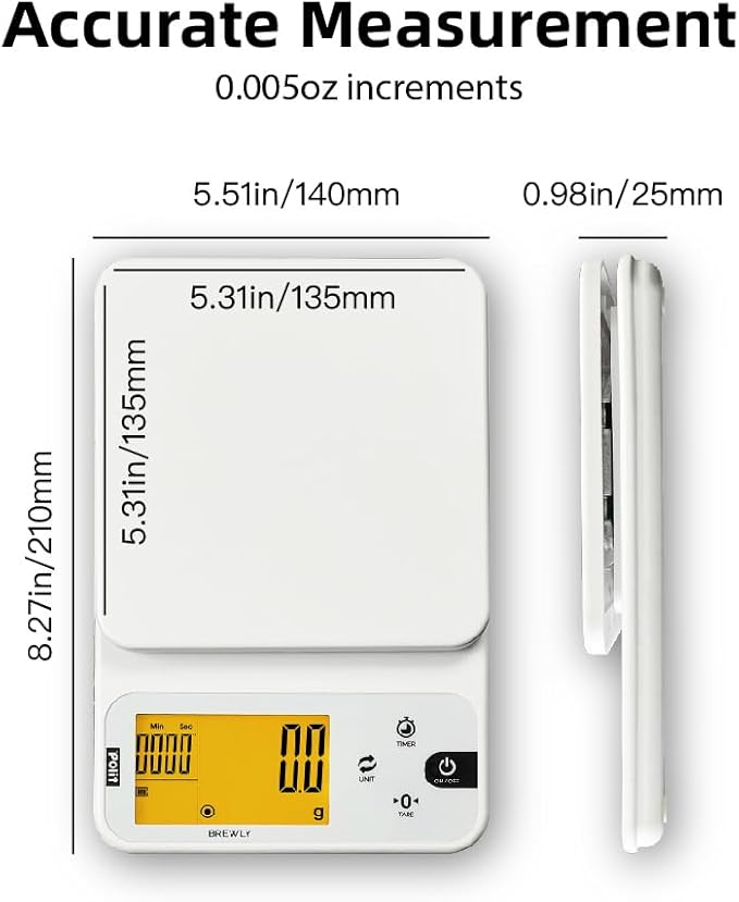 - 【Triple-Range Precision for Every Brew】 Brewly delivers 0.1g, 0.5g, and 1g precision up to 13lb/6kg. In gram mode, the scale automatically adjusts resolution—0.1g for 0–500g, 0.5g for 501–1500g, and 1g for 1501–3000g—Ideal for pour-over coffee, espresso, spices, and baking with accurate weight control every time.