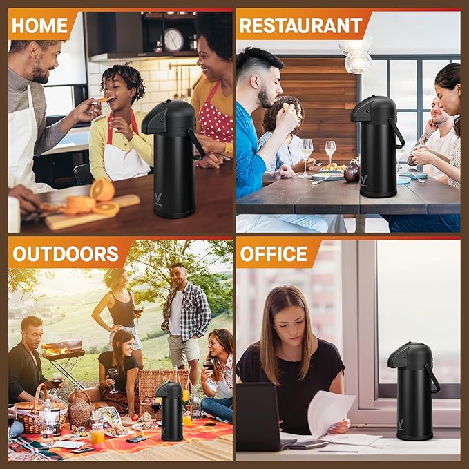 - DISPENSES EASILY AND QUICKLY: With the pump-action top design, this coffee dispenser with pump allows you to dispense your favorite beverage easily and safely with one press without lifting and tilting the entire airport, which greatly prevents the drinks from being overturned or leaked, and friendly to the elder and children.