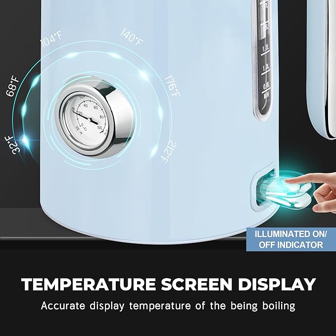 - PLEASING TO THE EYE丨MAKING TEA EASILY: Incorporating a vintage aesthetic, SUSTEAS updates the stalwart electric tea kettle with modern hues and features, and the classic lines and easy-to-read thermometer offer a bit of timeless old-world style. The ergonomic heat-resistant PP handle is designed for easy, stay-cool pouring. The honeycomb filter and the V-shaped gathering spout make the pouring water concentrated, and it will not drip and wet the table top