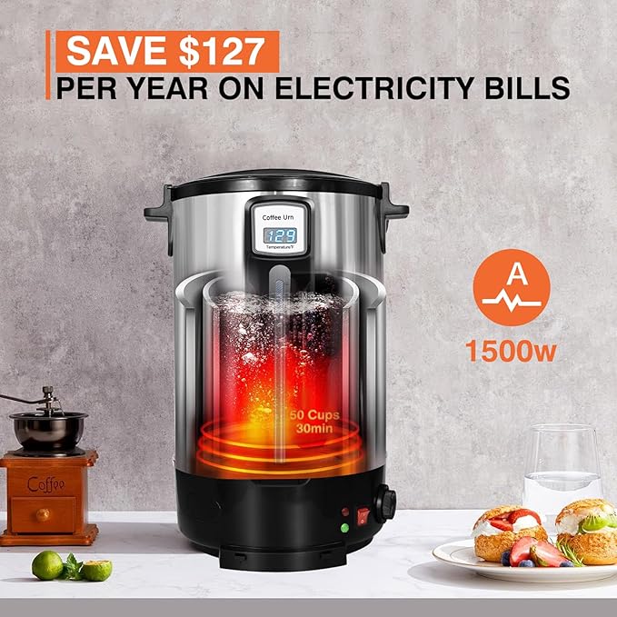 - HEAVY-DUTY DESIGN FOR LONG-LASTING PERFORMANCE:Constructed with a double-wall insulation system, the outer layer is made of 0.38mm thick 430 stainless steel, while the inner layer uses 0.4mm thick 304 stainless steel. This design retains heat significantly longer than single-wall models. Equipped with cool-to-touch handles, a twist-lock lid to prevent spills, and a 120V American plug, this coffee urn ensures safety and reliability. Consumes 1500 watts when heating and only 120 watts in keep-warm mode for energy-efficient operation.