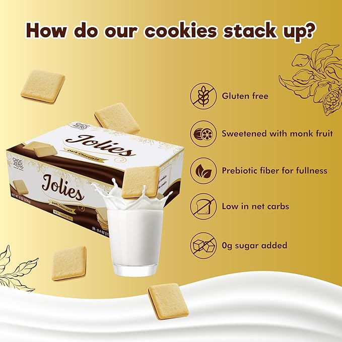 - 12g of prebiotic fiber per 3 cookies: indluge with ChocZero Dark Chocolate Jolies and feel satisfied for longer