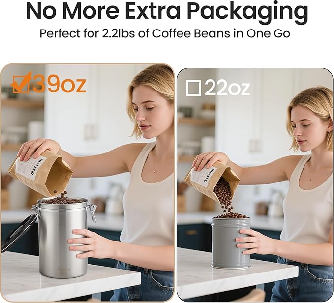 - 【Perfect for 2.2lbs Package Storage】This 39OZ coffee canister is specifically designed to accommodate 2.2lbs coffee beans storage. It eliminates the trouble of having to use clip - sealed secondary packaging for leftover beans due to insufficient capacity. For whole bean, hold a minimum of 35.5oz | 1.1kg | 2.2lbs common bag sizes found in the market. For ground, hold extra to 40oz | 1.13kg | 2.5lbs.