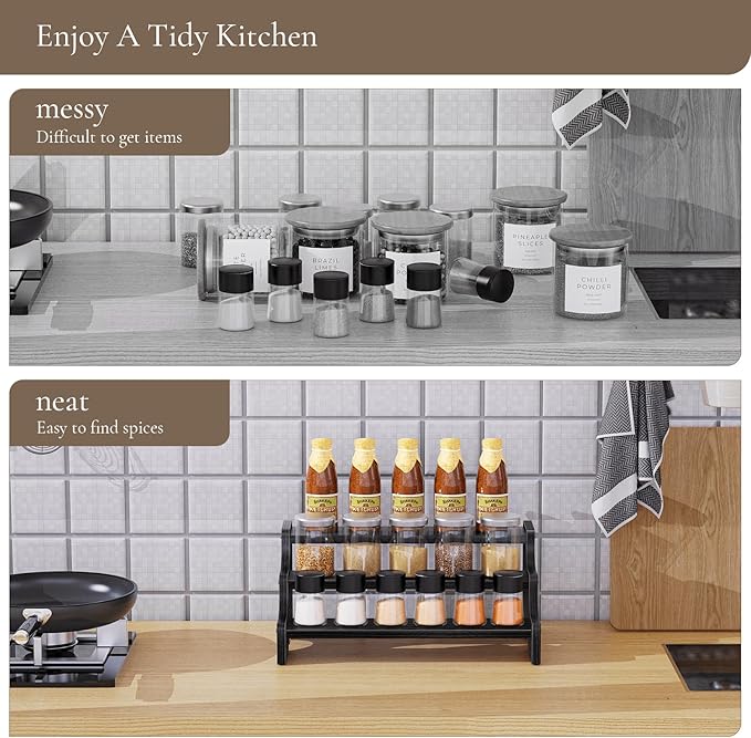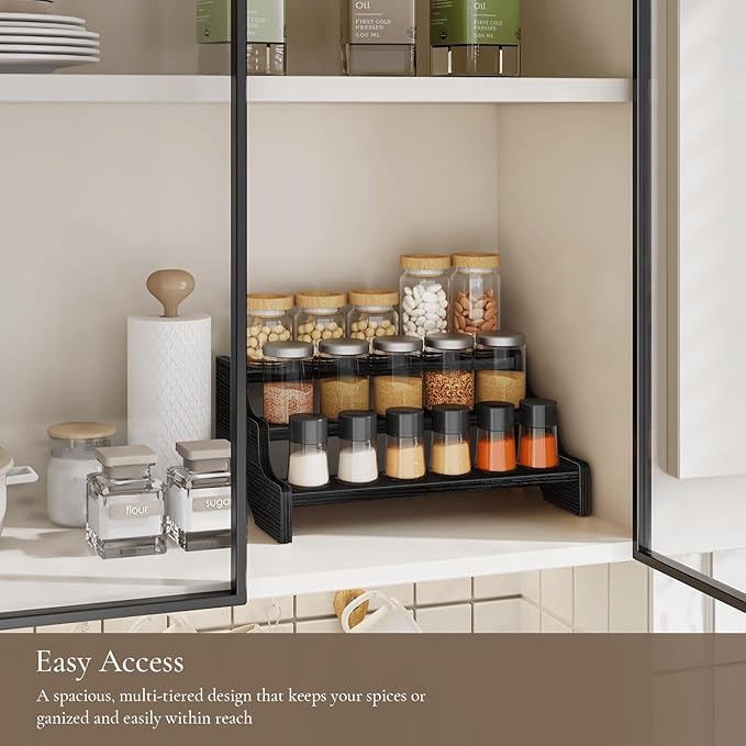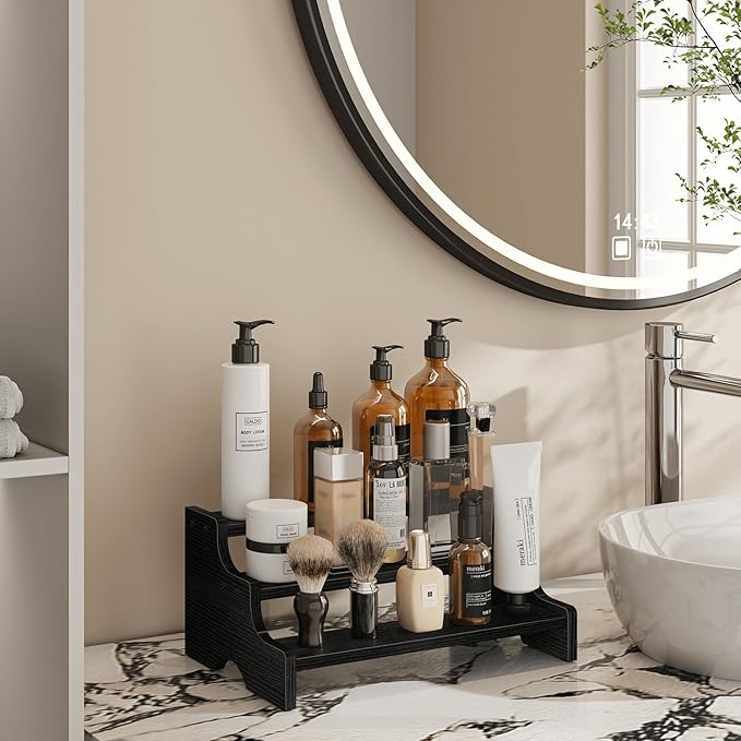 - SPACE-SAVING DESIGN: Measuring 13.8 inches wide, this compact wooden multi-tier shelf stand fits neatly on countertops or shelves, maximizing your counter storage. The raised tiers help to create an eye-catching feature for your items.