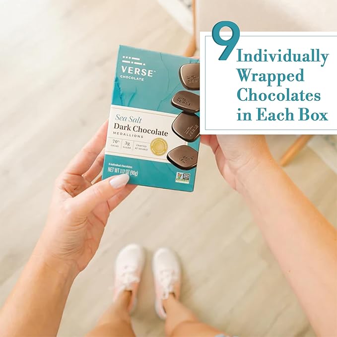 Verse Dark Chocolate Sea Salt Squares - Only 3g Cane Sugar - Creamy 70% Cocoa Dark Chocolate - Individually Wrapped Cacao Bar Squares (9 Count, 2 Pack)