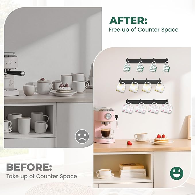 - Wall-Mounted Space Saver: Maximize unused vertical space with this coffee mug holder organizer. Keep countertops and cabinets clutter-free while turning your mug collection into a functional and eye-catching display