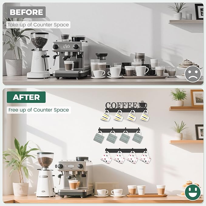 - Wall-Mounted Space Saver: Maximize unused vertical space with this coffee mug holder organizer. Keep countertops and cabinets clutter-free while turning your mug collection into a functional and eye-catching display