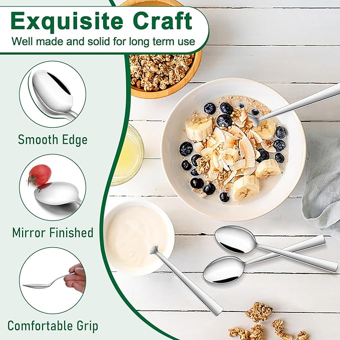 - EXQUISITE CRAFT: The handle of dessert spoon is ergonomically designed with nice curve for comfortable grip, Sleek edge without rough burrs won’t scratch your mouth and lip, Round edge handle with plain design allows for elegant and timeless appearance, Match well with your existing cup and table settings