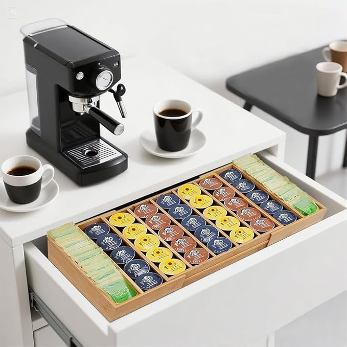 K Cup Holder Bamboo Coffee Pod Holder Drawer Organizer, Expandable K Cup Pod Storage Tea Bag Storage for Coffee Station Home Office and Kitchen