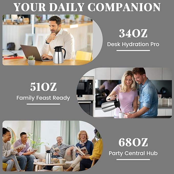 - Versatile & User-Friendly:Large coffee carafe (34 oz / 1 L) suits gatherings/offices. Pre-heat/pre-chill to keep coffee hot/cold longer. Sleek iced coffee carafe & hot tea thermos in one