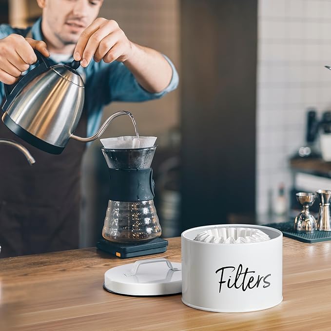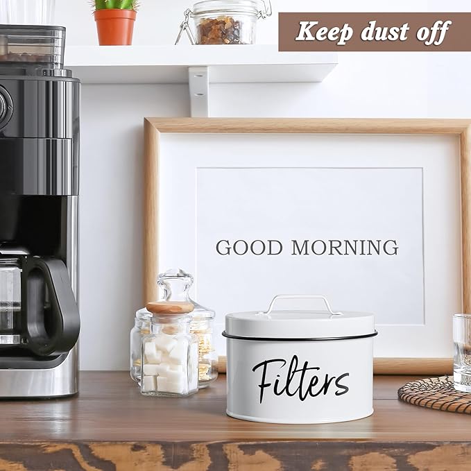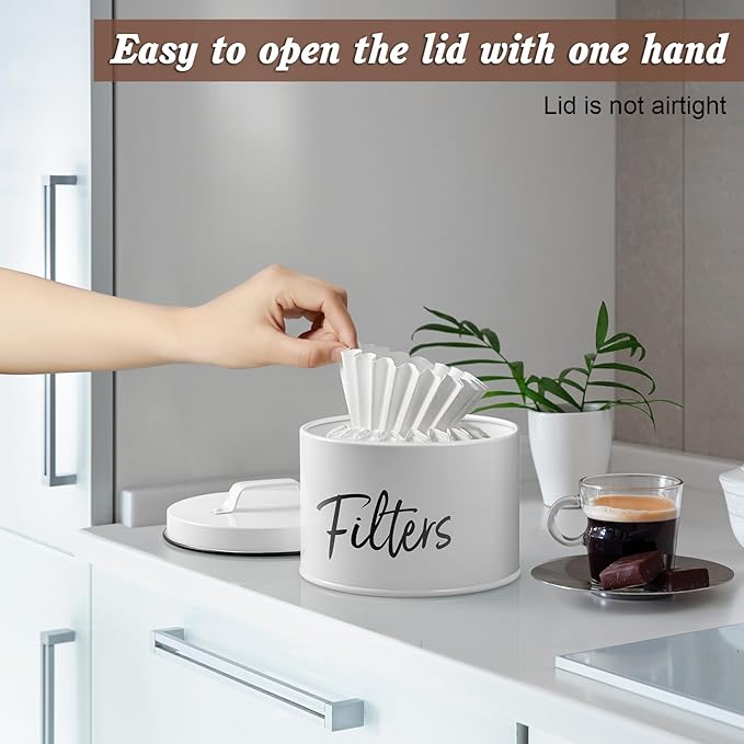 - Coffee Filter Holder with Lid: The lid of coffee filter storage helps keep dust off of the actual filters, and the handy handle on top lifts the lid off. It helps keep your coffee accessories tidy and organized, easy access to the items you want(Tips: The lid is not airtight)
